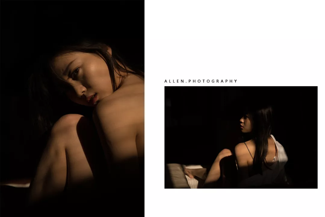 这张照片可以看到,远处投射进房间的阳光与映在模特上被投射的清晰阴影之间有个狭小的着光带,同时,可以看到透过玻璃窗的阴影有线条感,这样中间的光亮处自然而然就成为画面的视觉中心。模特处于这个位置,也就成为了画面的中心,产生具有趣味性的明暗对比。