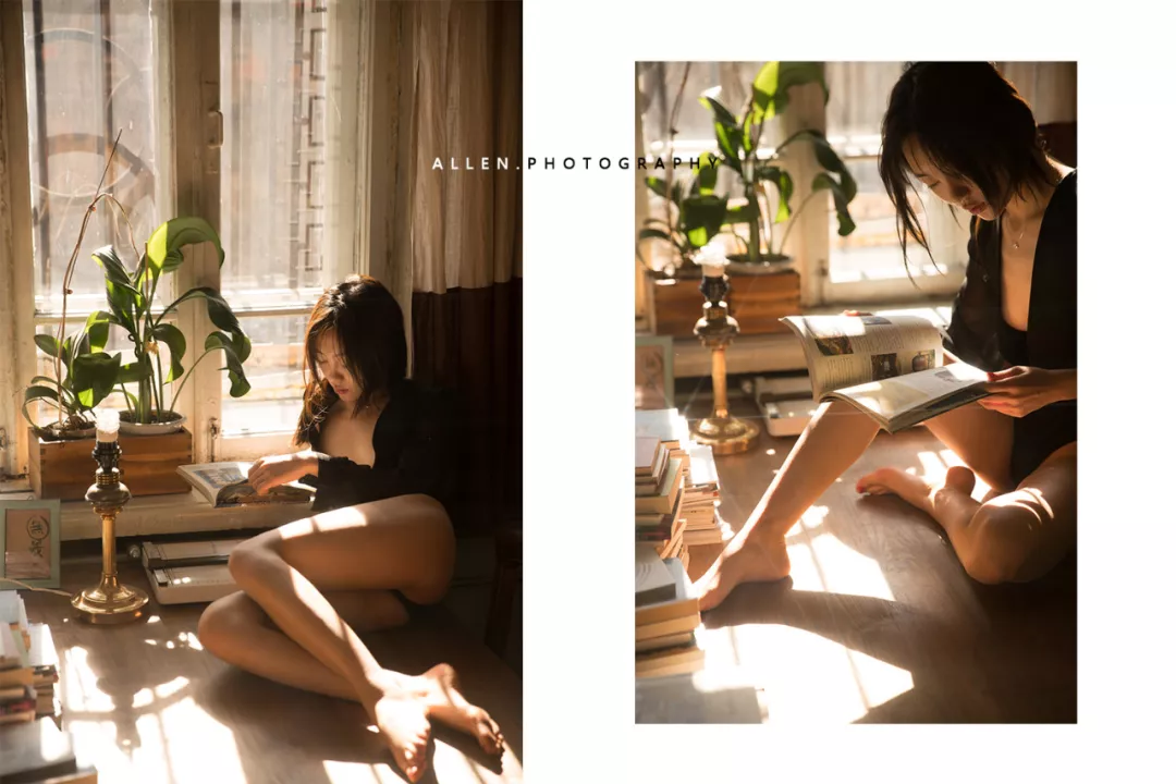 这张照片让模特低下头来,手中的书起到了一定的补光作用,获得了柔和细腻的面部光照效果。其实本张作品在拍摄时的本意是让模特抬起头来,但是大家可以想一想如果抬起头会形成什么效果?如果抬起头,那透过玻璃窗照射下来的光斑会将模特的面部切割得很不美观,这个光线就不适合投射到脸部。可见,光线的使用对于拍摄来说是多么重要。