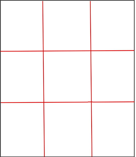 九宫格构图是指将画面用两条横线两条竖线平分为九个格子如下图,并利用其中一格或者线条交叉处的一点来放置人物,其余的地方用来安放陪体和背景